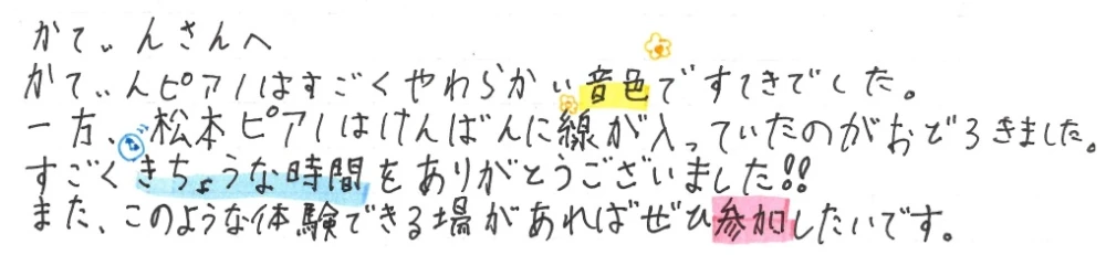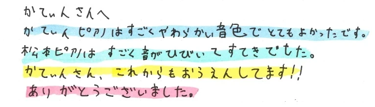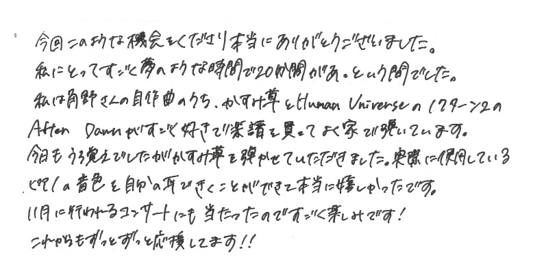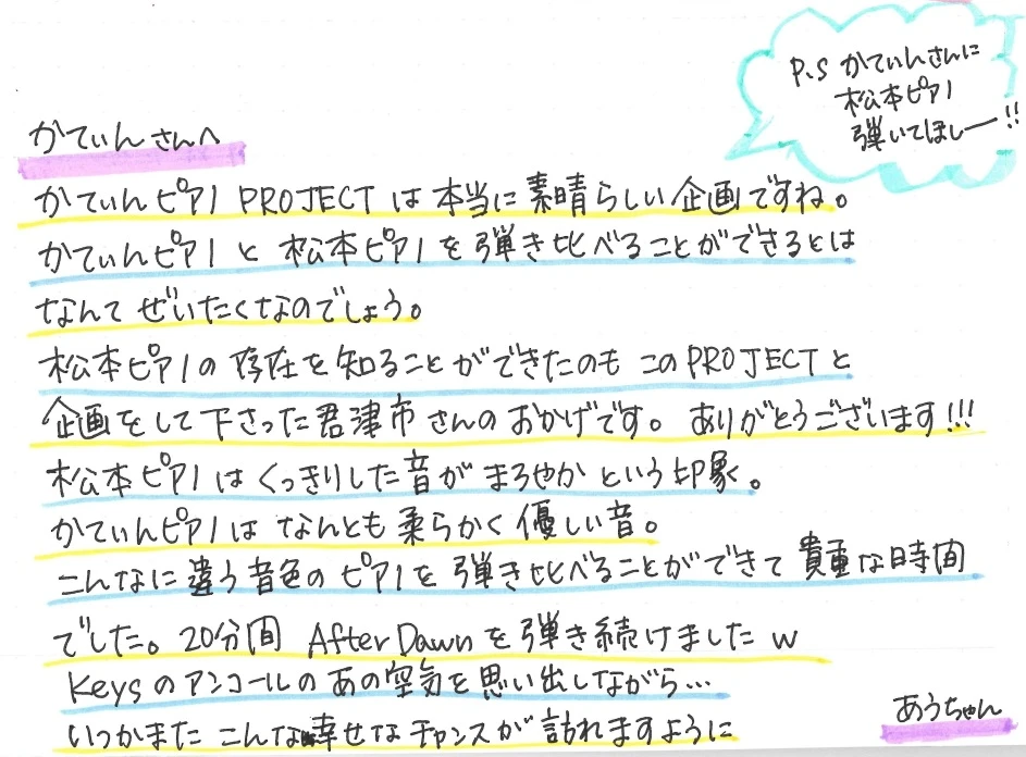 演奏体験を終えた方には「メッセージノート」を用意しました。「憧れのかてぃんピアノに触れられて感動しました」「松本ピアノの音色が忘れられません」──そんな感想や角野さんへの温かい言葉が数多く書き残されました。このノートは後日、角野さんのマネージャーを通じてお渡ししました。参加者の感動や喜びを、今回の素敵な演奏体験を実現してくださった角野さんにぜひお届けしたく、市として大切に託しました。