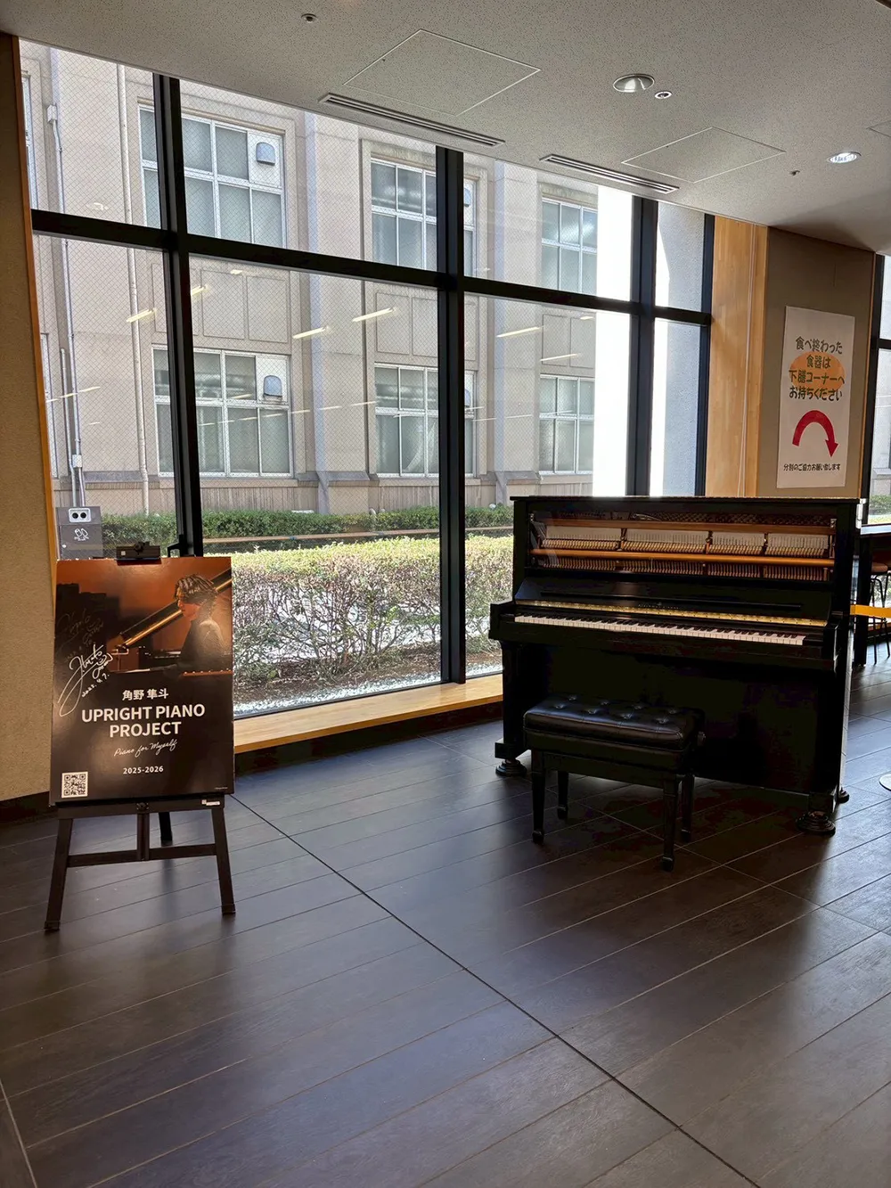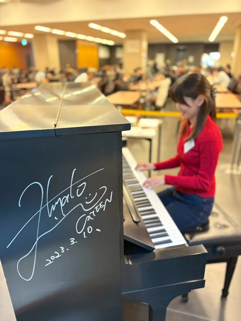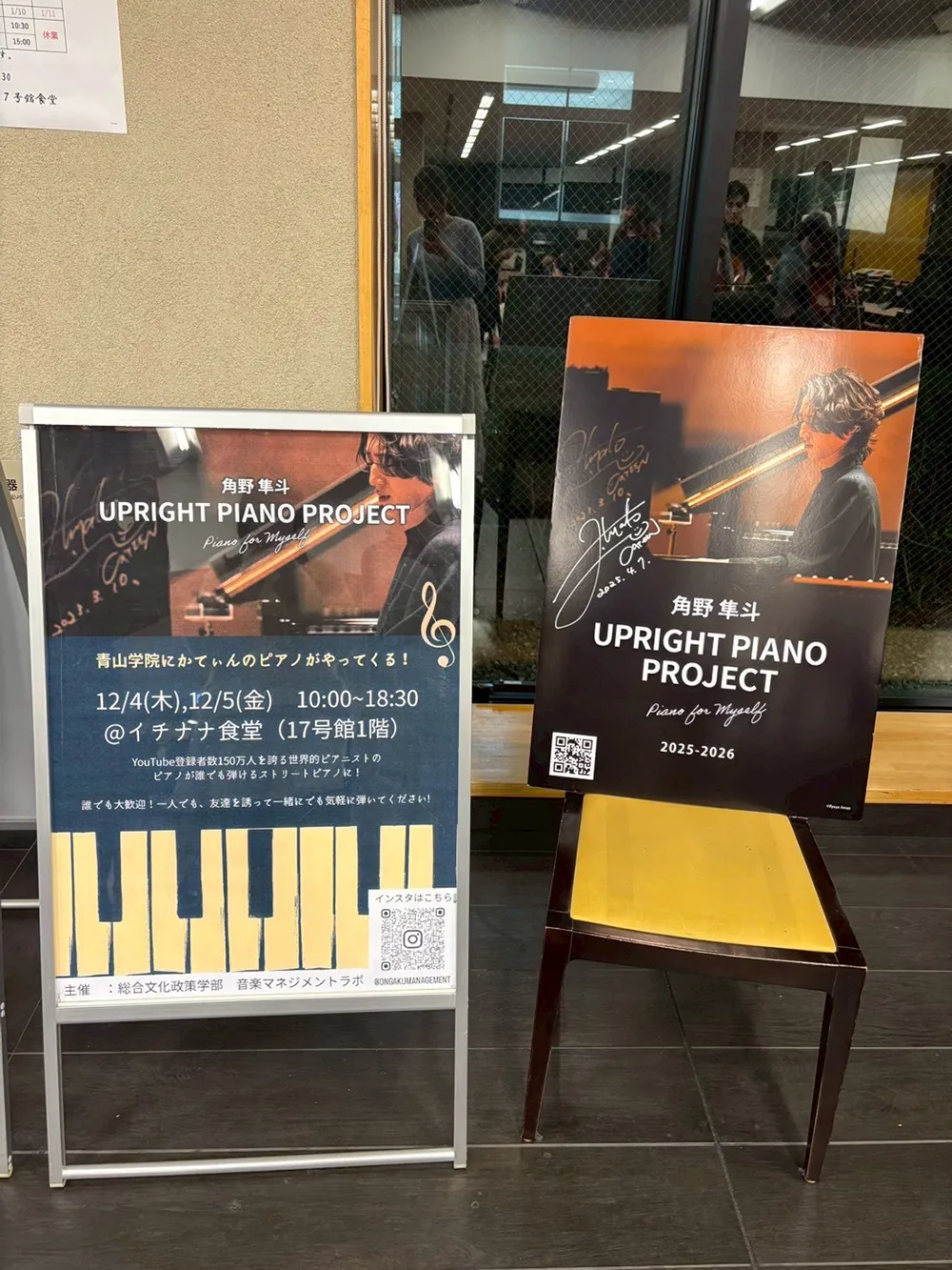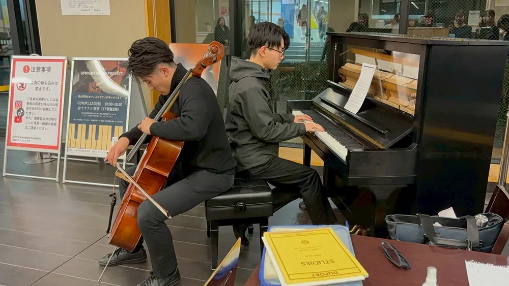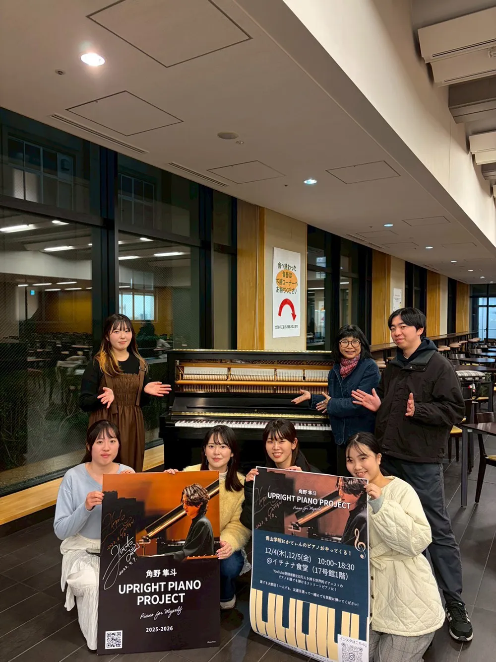 2025年12月4日~5日の2日間、青山学院大学青山キャンパスの食堂において、青山学院大学総合文化政策学部音楽マネジメントラボ(担当:板垣千佳子)がUPRIGHT PIANO PROJECTを開催させていただきました。本ラボでは初めての試みとなったプロジェクトでしたが、想像以上に多くの方が足を止め、ピアノに触れてくださいました。青山学院の幼稚園のお子さんから高校生・大学生、そして職員の方まで幅広い世代が参加し、「久しぶりに弾けて嬉しい」「ずっと置いてほしい」といった声が寄せられるなど、音楽をきっかけにしたあたたかな交流が自然と生まれていきました。