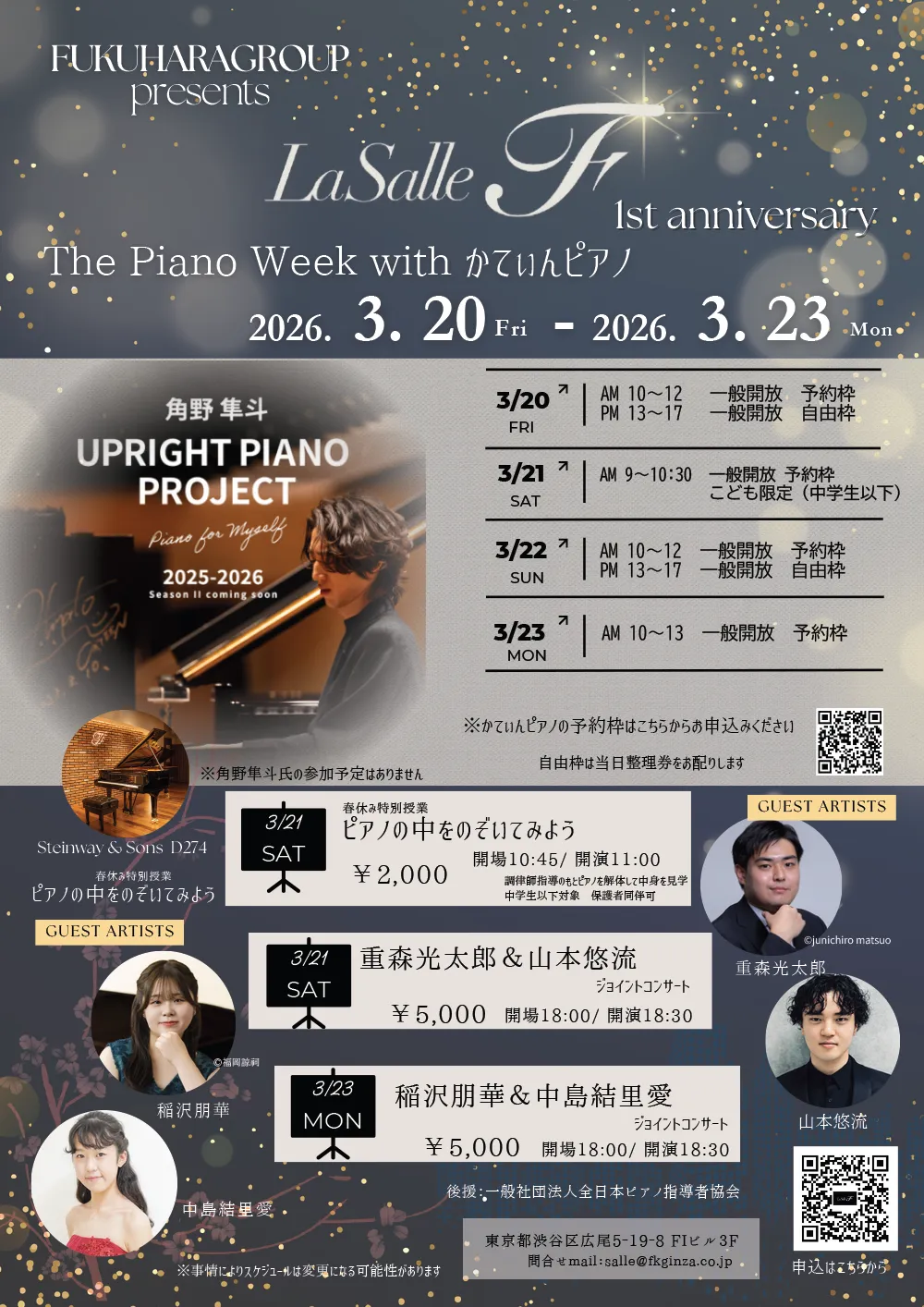 2025年1月に東京・広尾に開設された多目的サロンホールLa Salle F(ラ・サール エフ)は、オープン1周年を記念し、特別イベント「The Piano Week with かてぃんピアノ」を開催いたします。