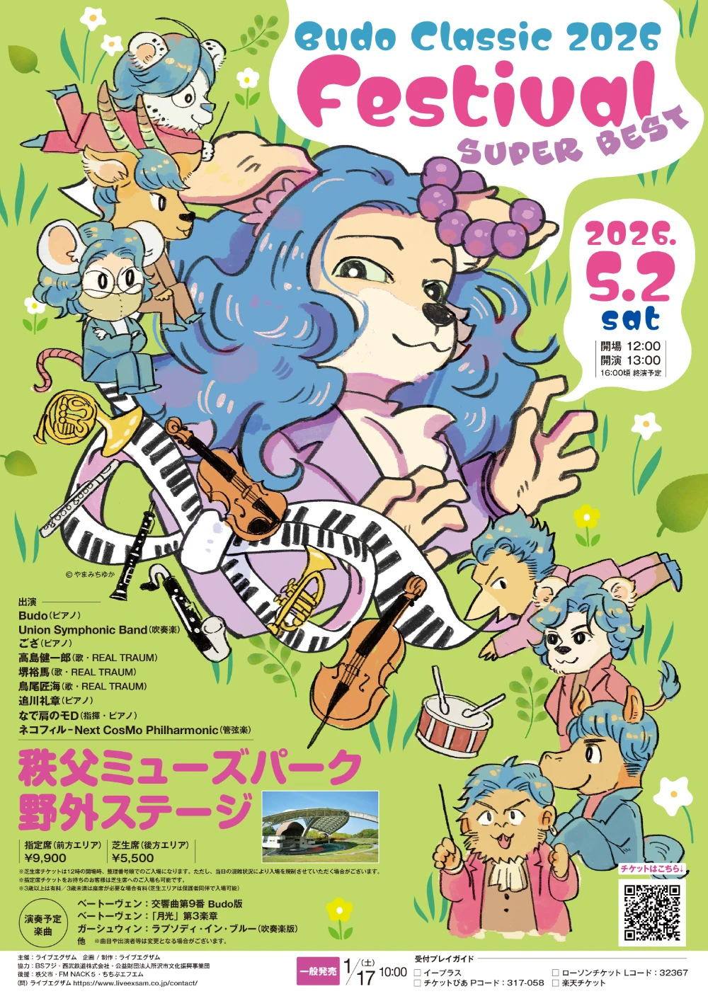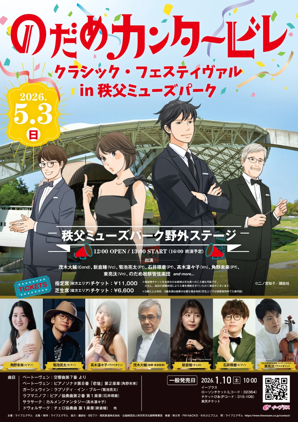 5月2日はピアニストBudoが率いるフェス『Budo Classic Festival 2026 〜SUPER BEST〜』、5月3日は『のだめカンタービレ クラシック・フェスティヴァル in 秩父ミューズパーク』が野外ステージで開催されます。同フェスの会場である秩父ミューズパーク野外ステージの入り口付近にかてぃんピアノ(スタインウェイ社製アップライト)を設置します。一般開放の時間帯はどなたでも演奏可能ですので、ぜひお客様の演奏でもフェスを盛り上げてください!